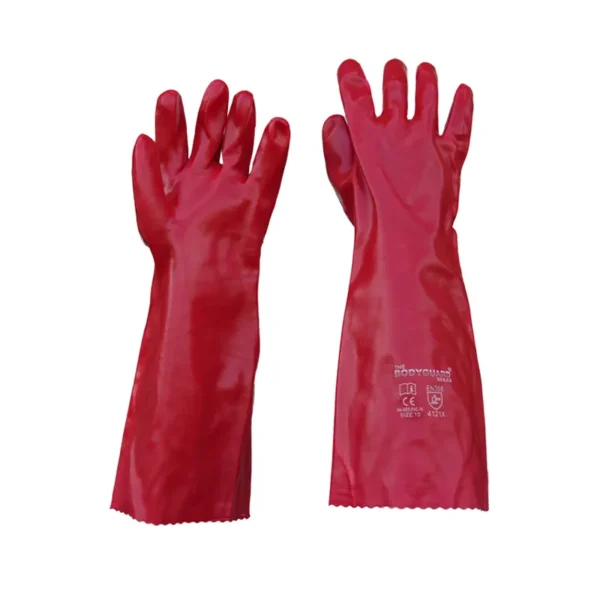 Bodyguard Red, 18 PVC red is an open cuffed, fully coated gauntlet with an 18inch (46cm) overall length including excellent grip for safe and secure handling in wet and oily conditions. They offer excellent safety protection with good puncture, tear and abrasion resistance against mechanical hazards.